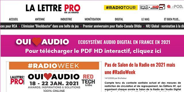 La Lettre Pro de la Radio est le site incontournable depuis plus de 10 ans pour tous les professionnels de la Radio, du podcast et de l'Audio Digital. Chaque jour découvrez 10 articles et abonnez-vous à la newsletter quotidienne.