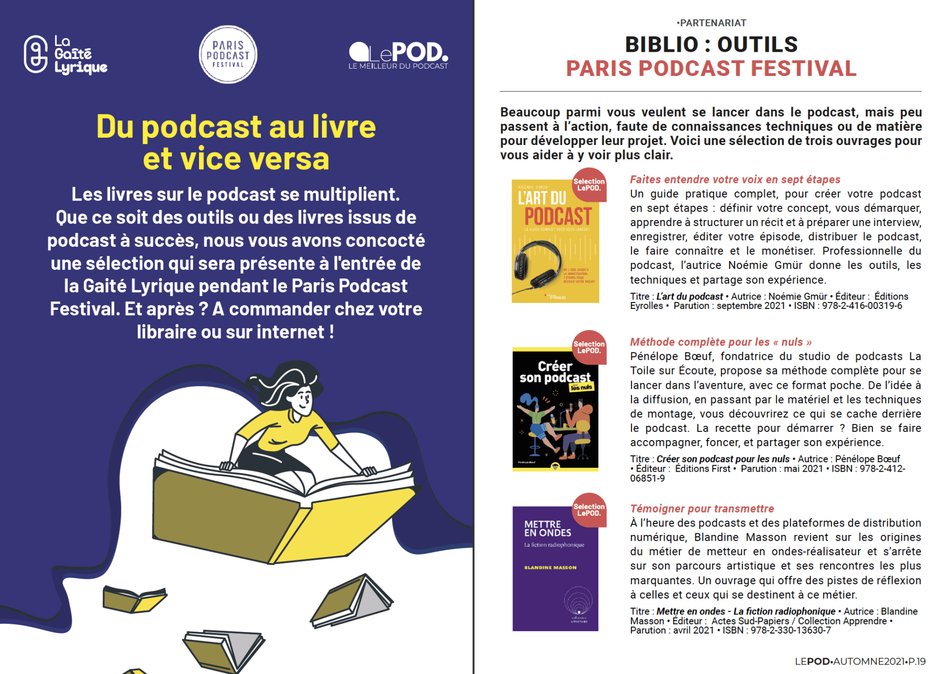 Les Éditions HF, premier éditeur des professionnels de l'audio – avec La Lettre Pro de la Radio, le Salon de la Radio et de l'Audio Digital et ConnectOnAir.com –, ont lancé en 2019 LePOD, le 1er guide grand public, entièrement gratuit, pour tout connaître de l'univers du podcast. Un guide papier en format poche avec une ligne éditoriale branchée et décalée.